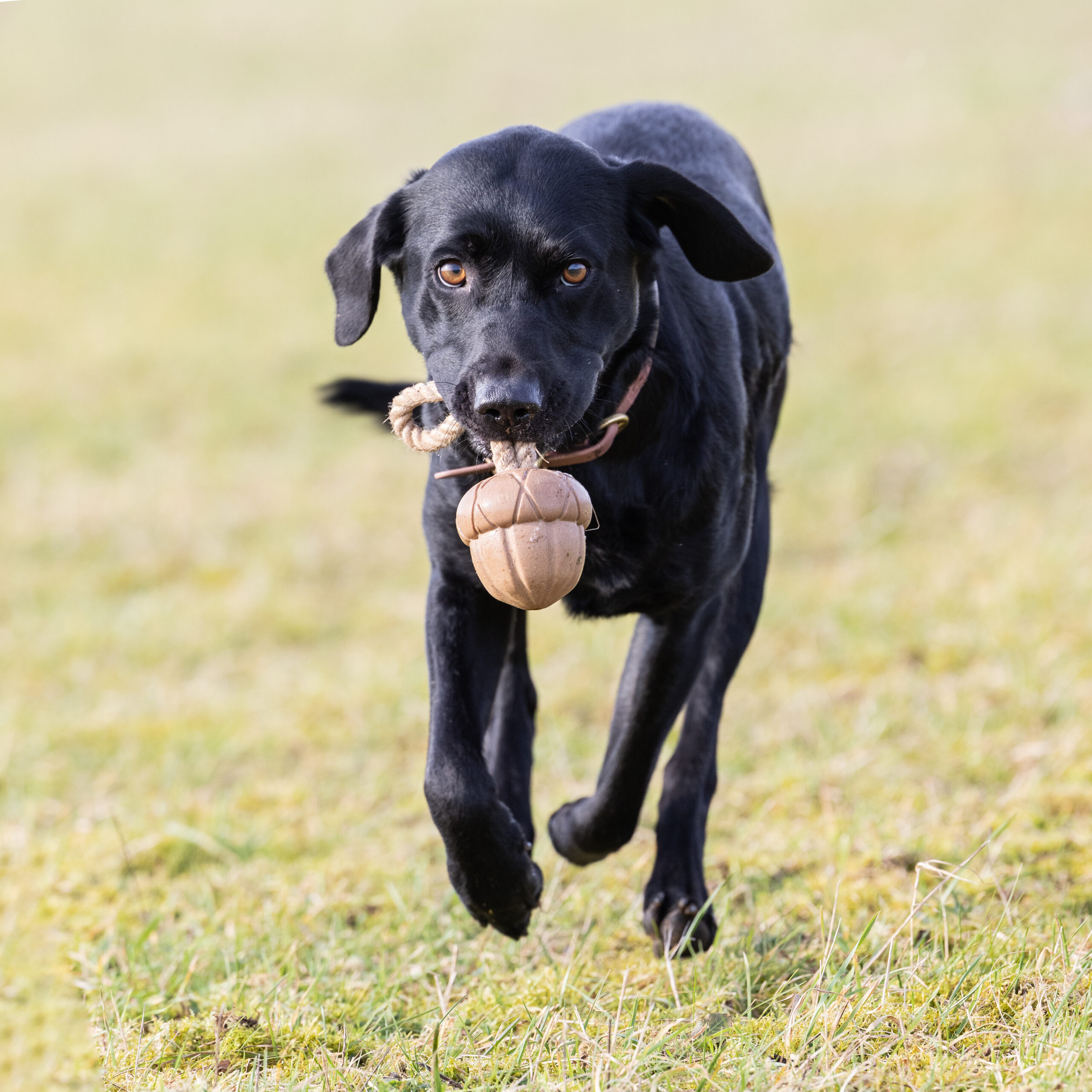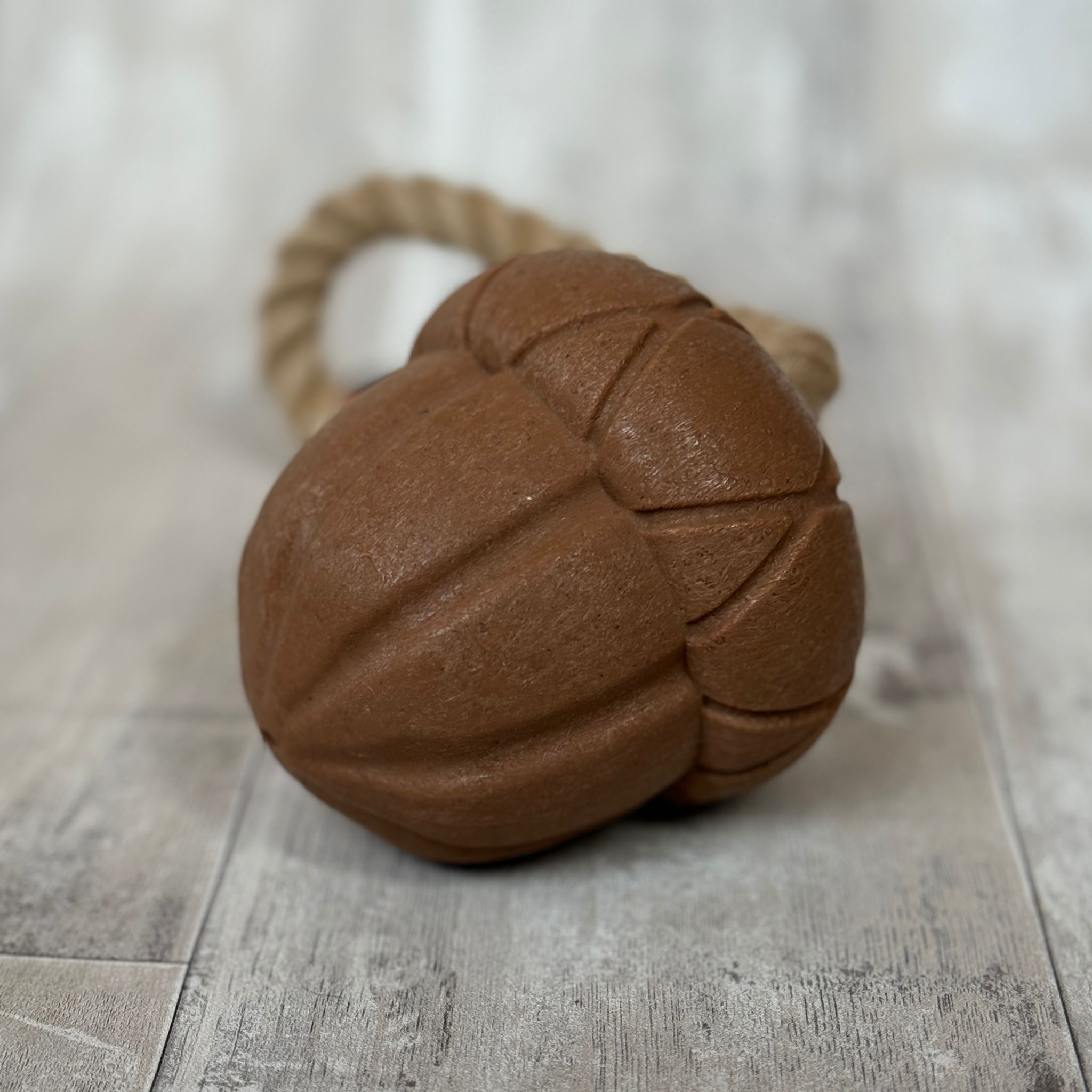 This Acorn is a great toy for those games of fetch or tug of war. The rope handle makes throwing for you easy and gives your dog something to grab hold of for retrieval. A great alternative to a regular ball, the hard acorn is easy to wipe clean is a really tough, meaning your game of fetch will last!