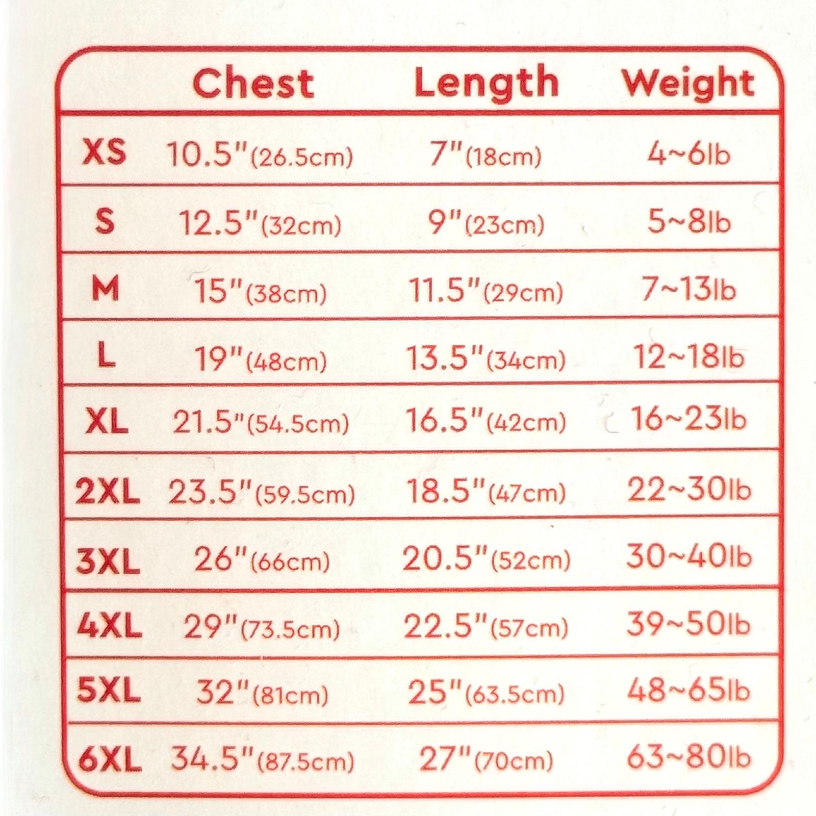 Please note we only stock the following sizes but we can get the smaller and larger sizes – on request. (Roo, who is a small 6kg pug in the photo wears M)