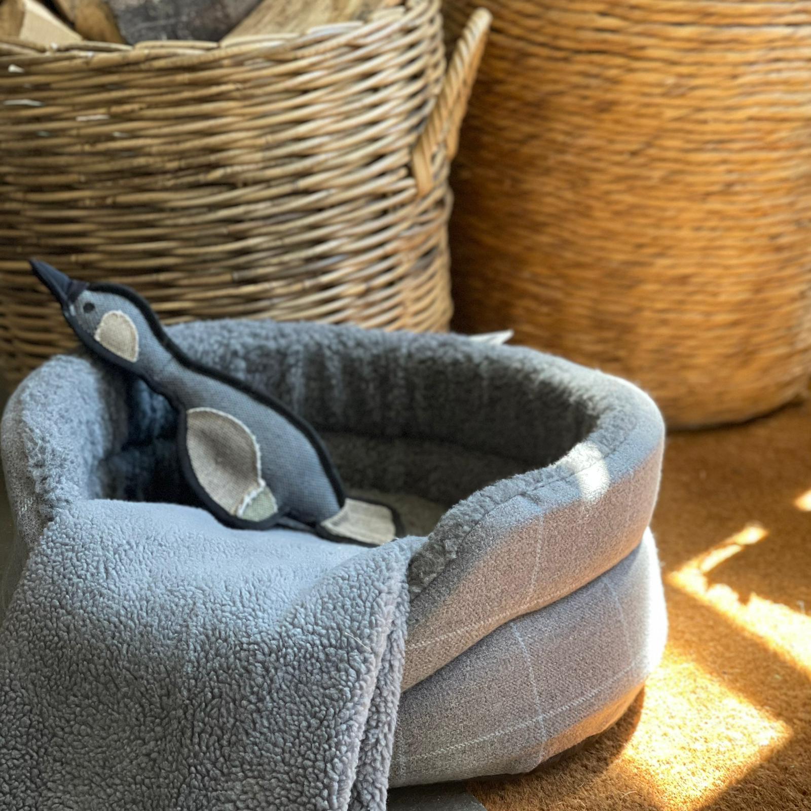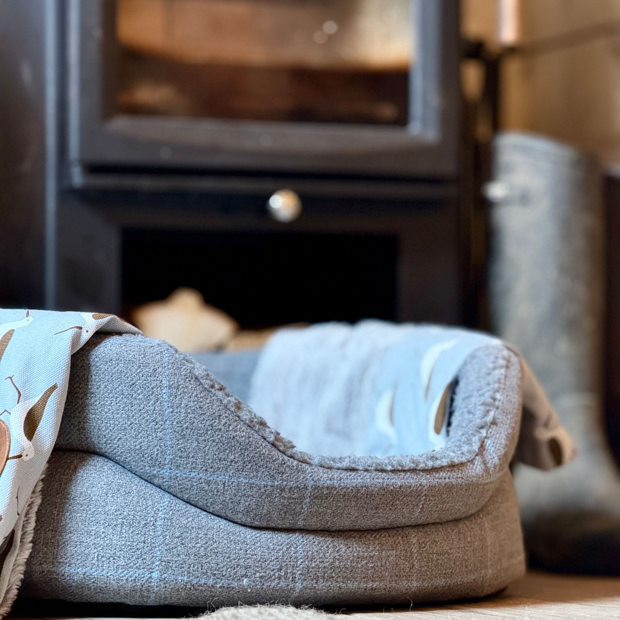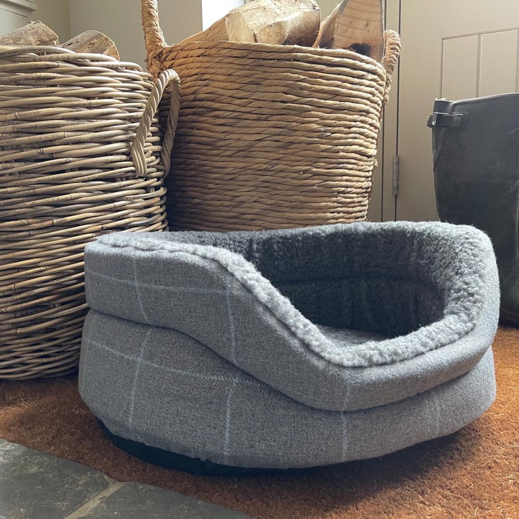 - Exclusive Chavenage Design – Only available at Bath Country Pets, featuring a light grey tweed with a subtle fine-line blue check, paired with a soft cream fleece interior.