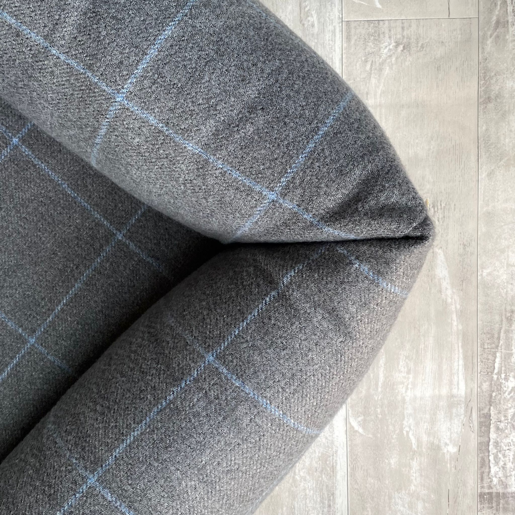 - Chavenage – A sophisticated mid-grey with a light blue fine-line check.