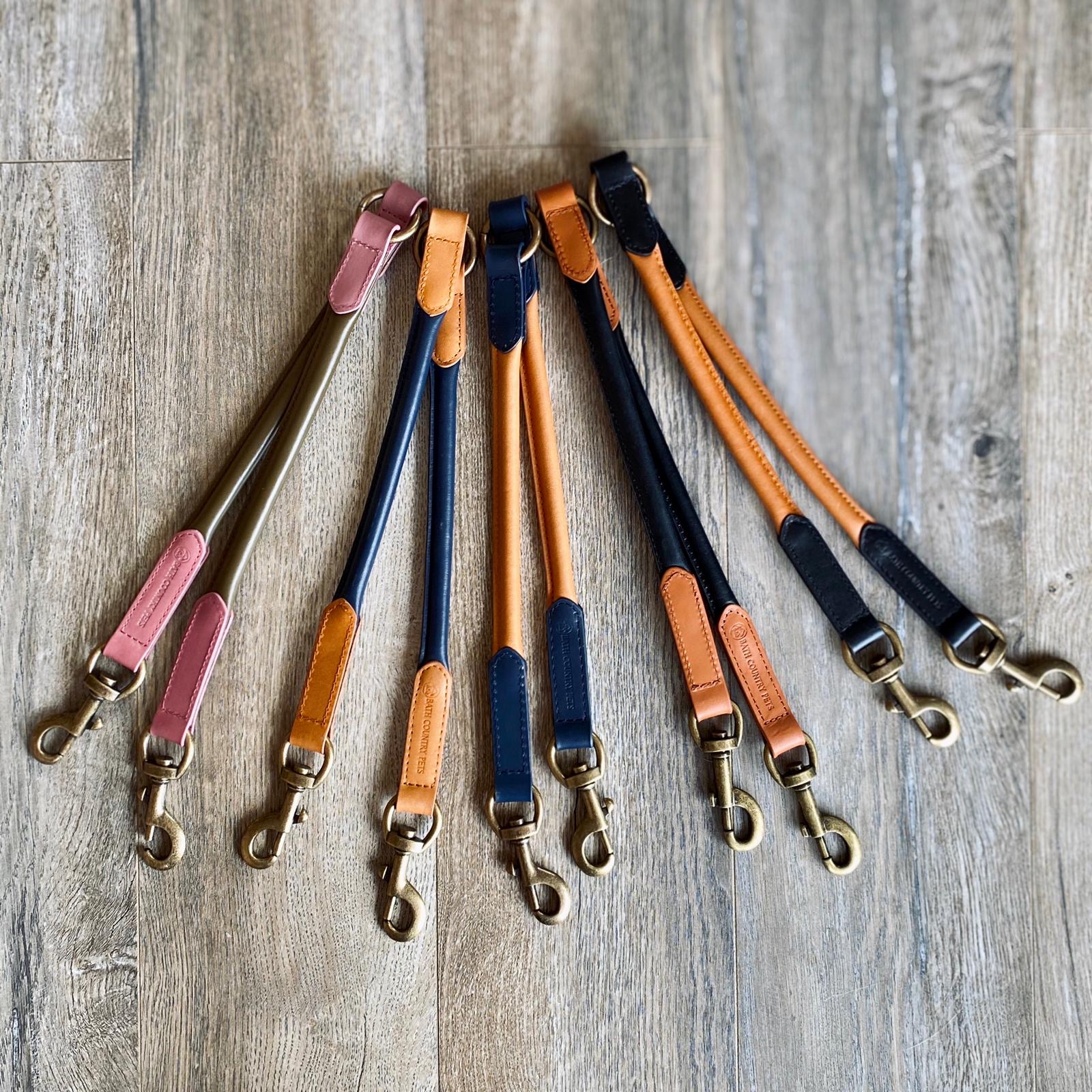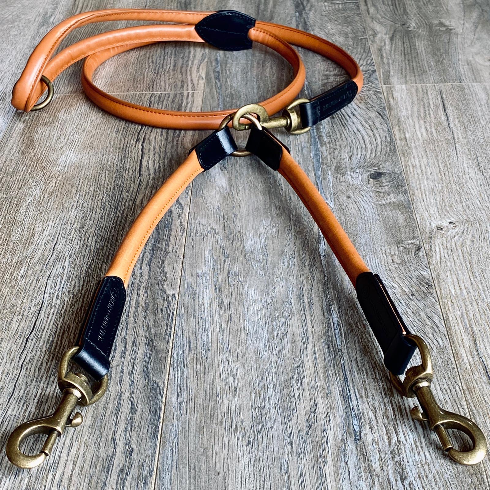 Super soft rolled leather with brass fittings make these elegant couplers the perfect solution to walking two dogs with ease. Connect this to both collars and have the convenience and control of just one lead between the two. The brass swivel trigger clip stops the lead from becoming twisted. These come in a number of colour options from our classic colour pallet. We have co-ordinating leads and collars to complete the set.