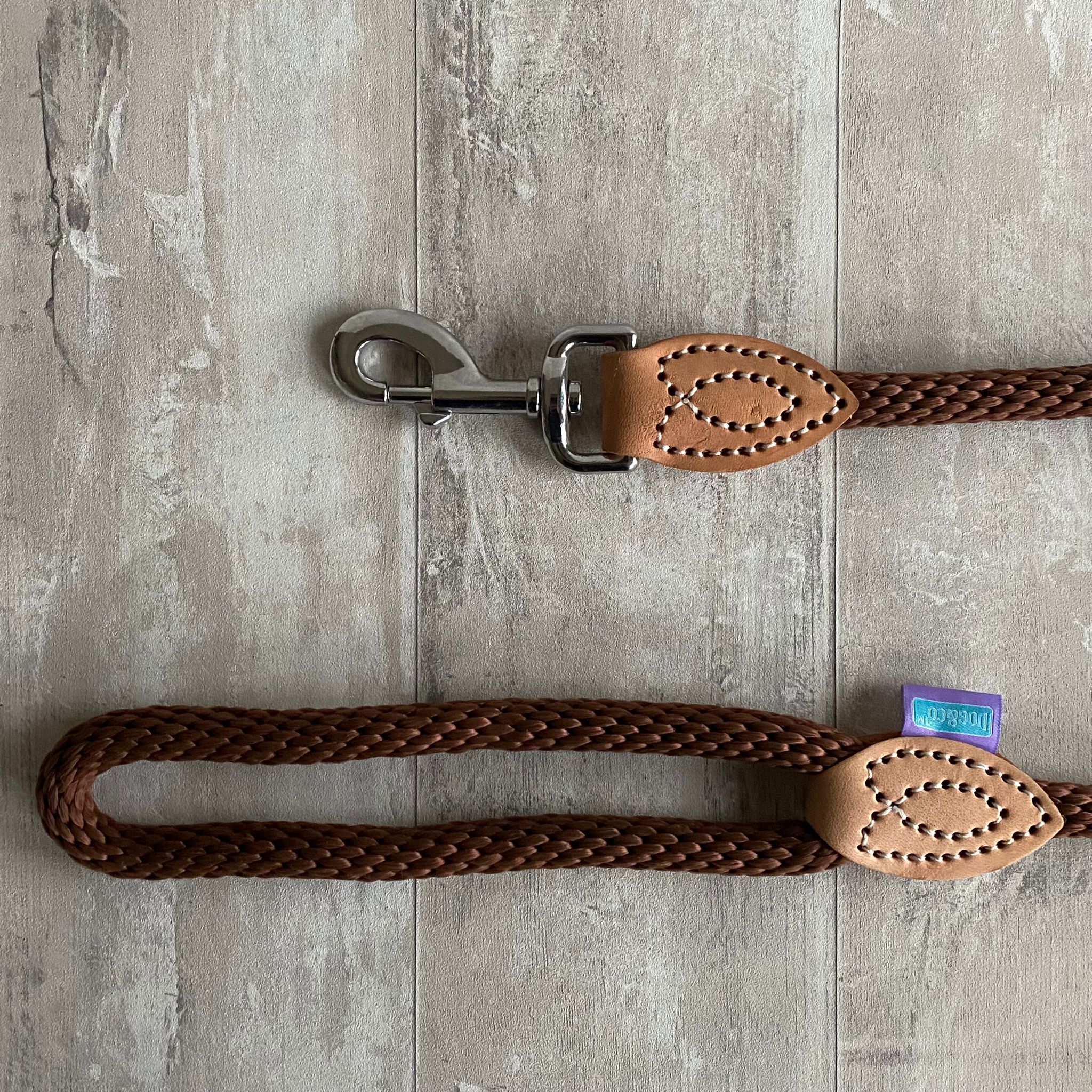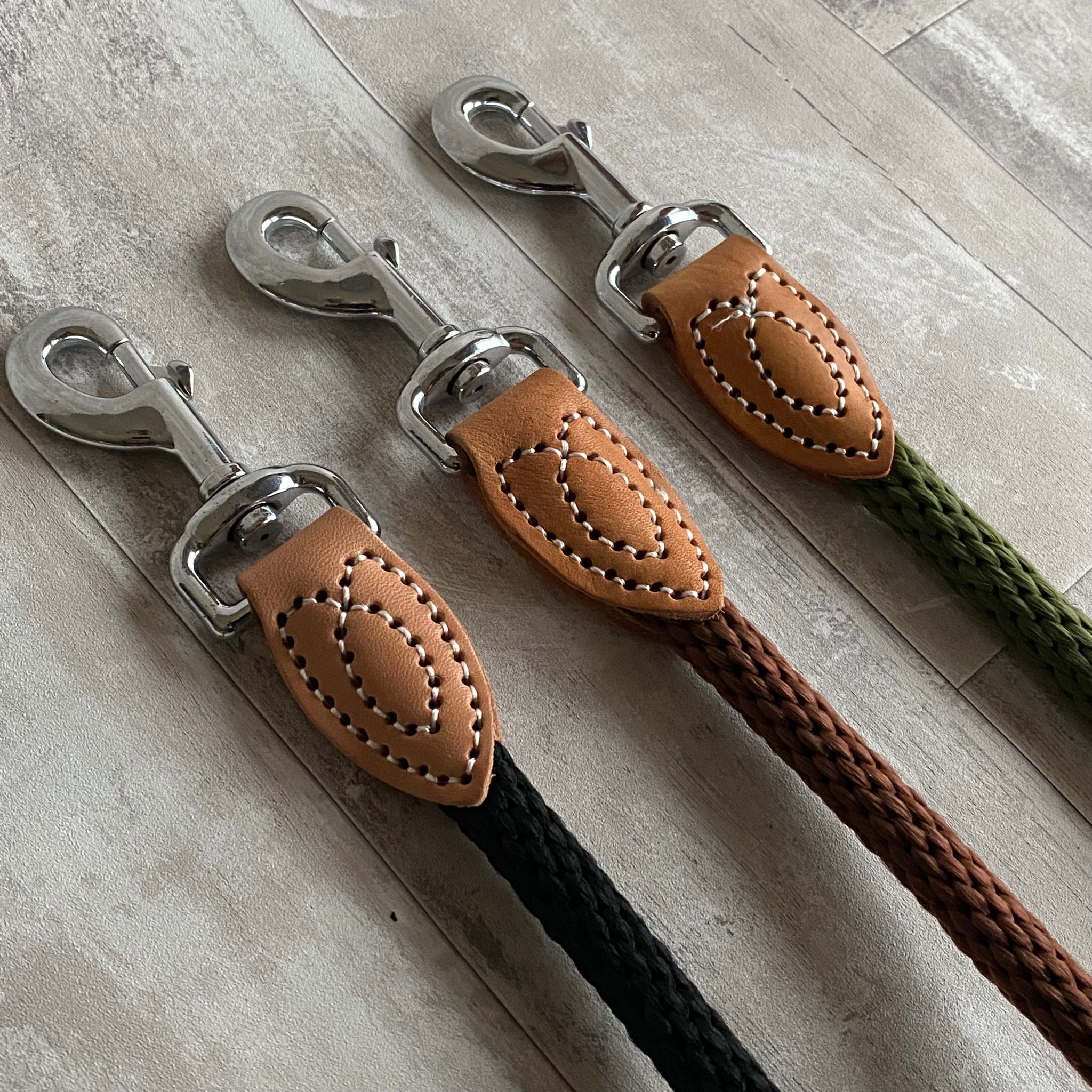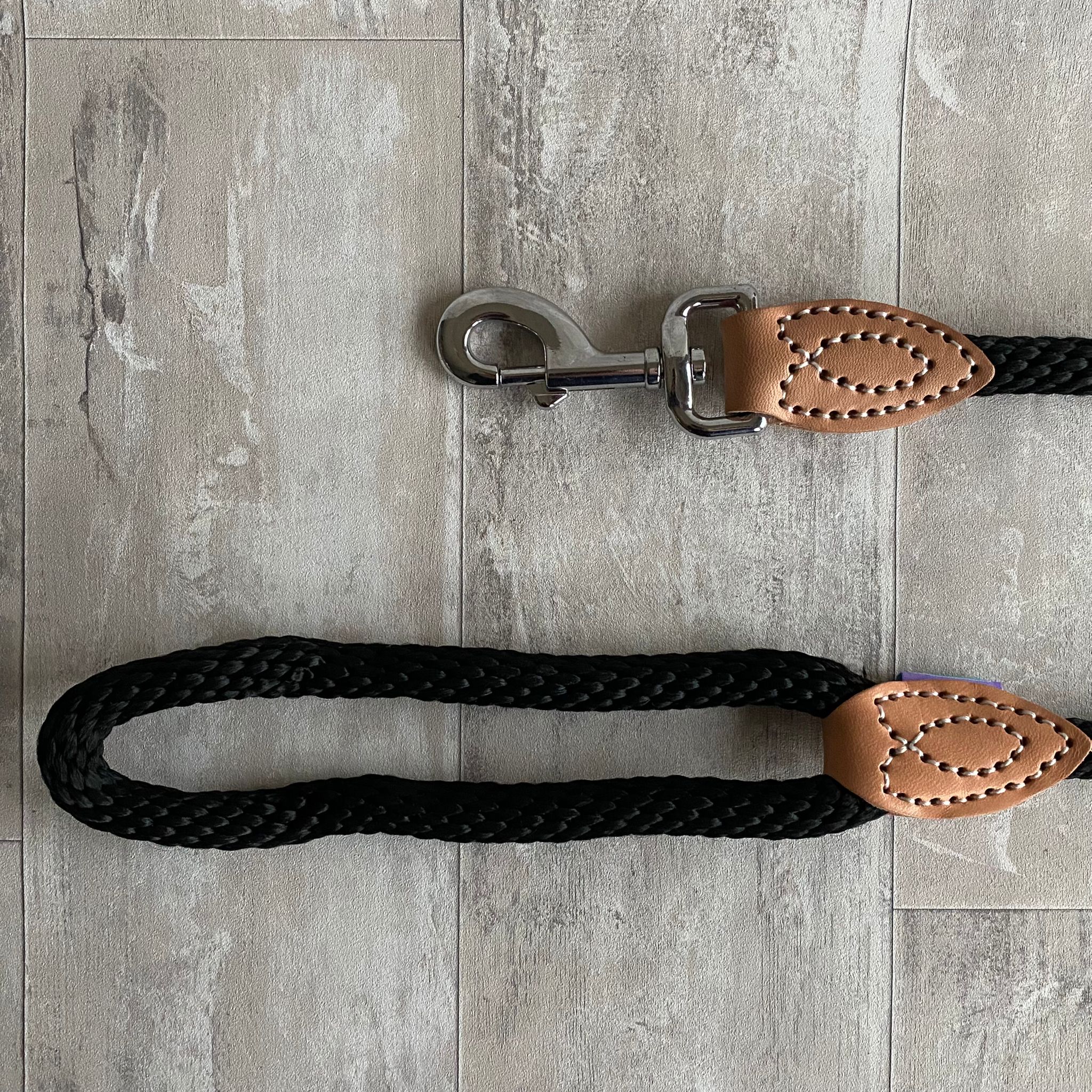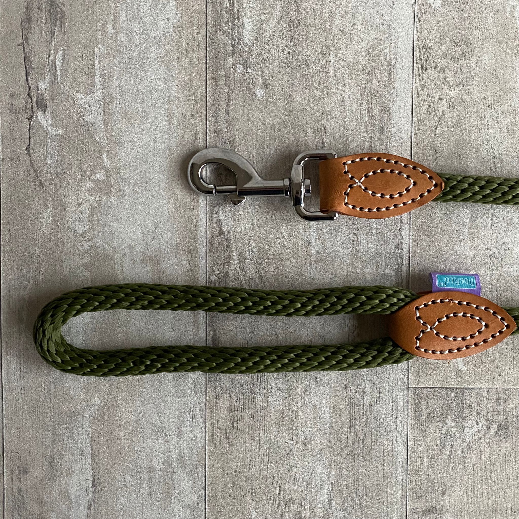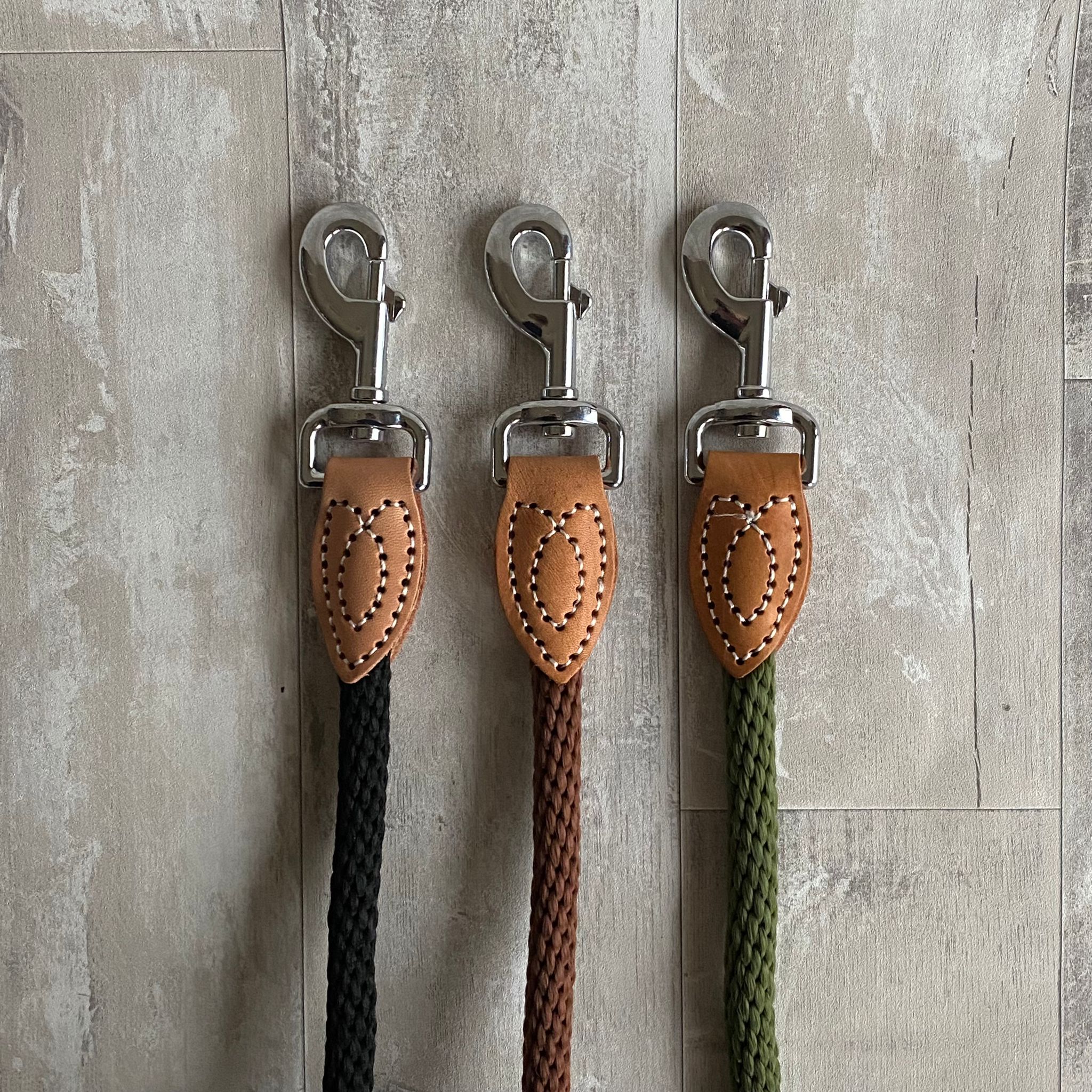 Super soft rope, finished with luxury real leather detailing and robust fittings make these practical one- metre leads comfortable for both you and your dog. This option is the trigger style, and 3 colour choices – a neutral black, olive green and smart tan.